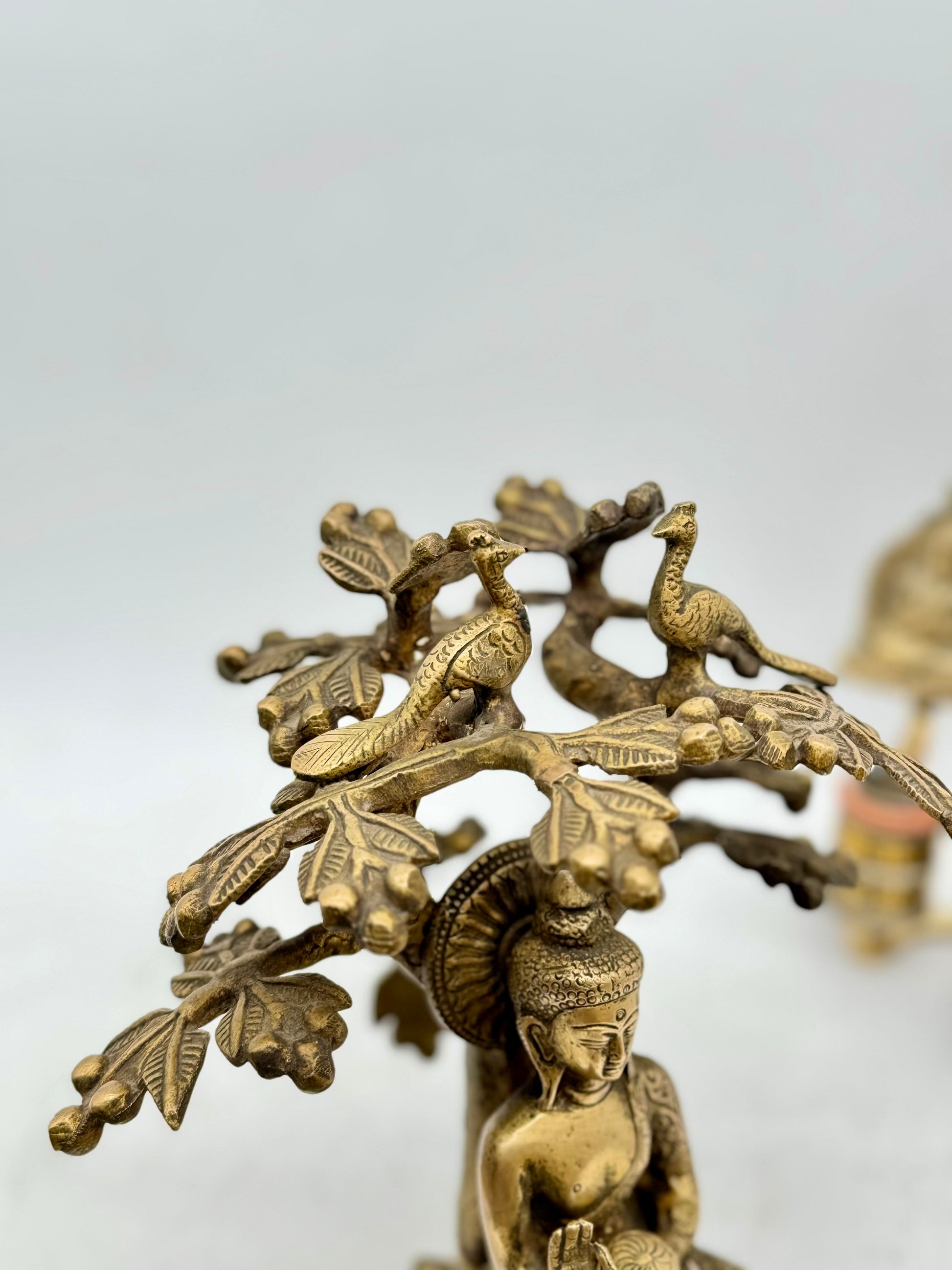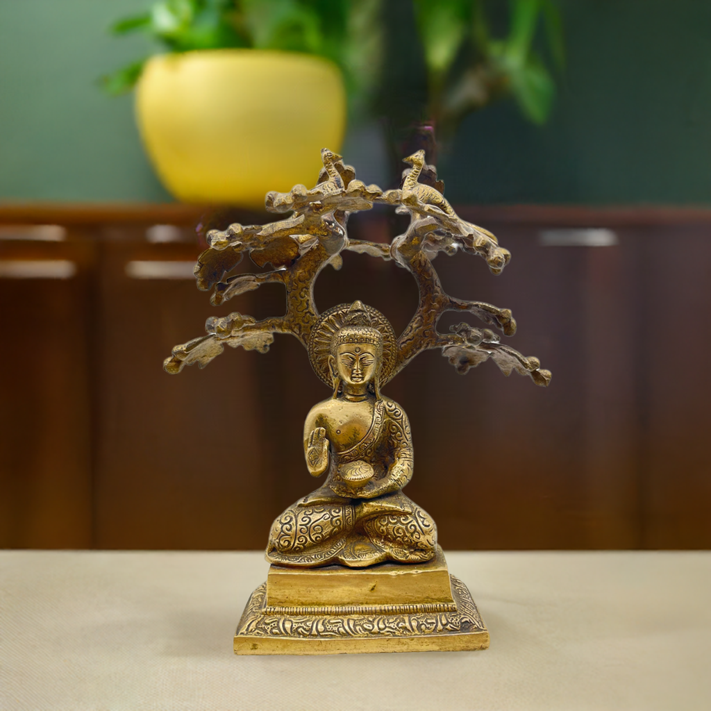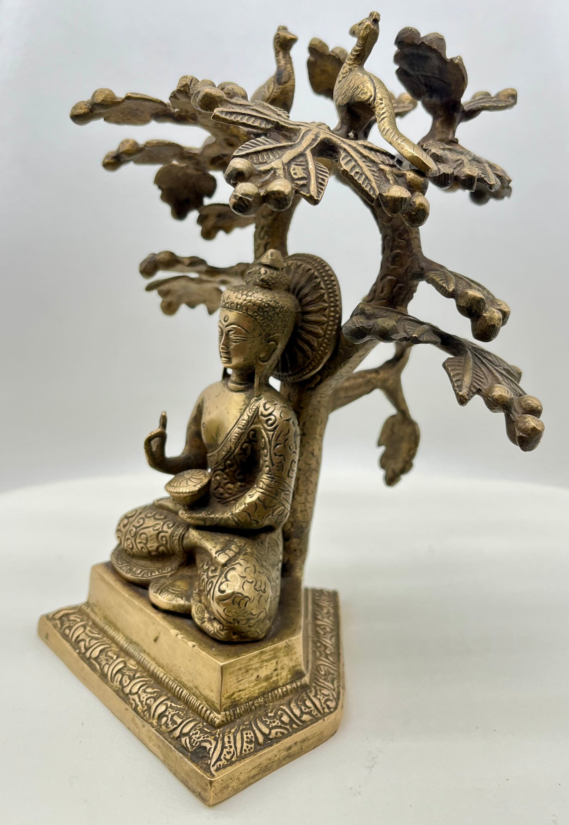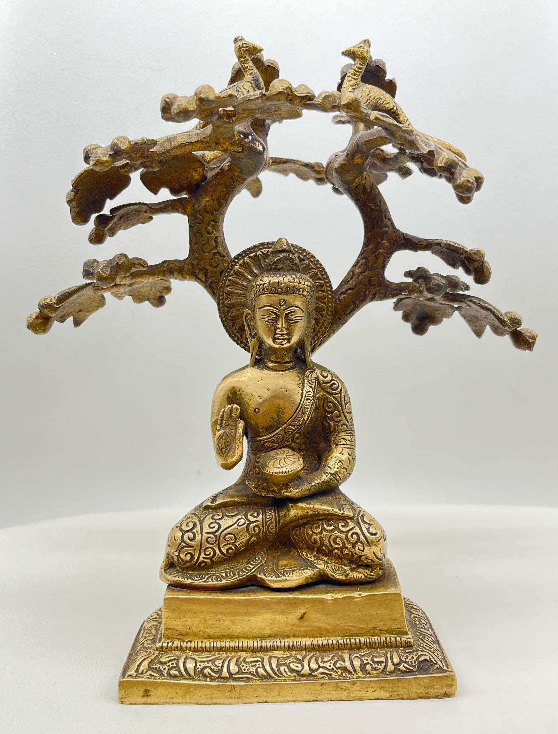 The Buddha is depicted in vajrasana, the diamond pose, symbolizing steadfast meditation and unshakable focus. His right hand is raised in Abhaya Mudra, the gesture of fearlessness and divine protection—offering silent reassurance and inner strength. He sits on a modest throne, with two birds perched above his head, symbolizing spiritual guardianship or celestial presence. Together, the posture and symbolic throne express calm authority, grounded wisdom, and a connection between the earthly and the sacred.
