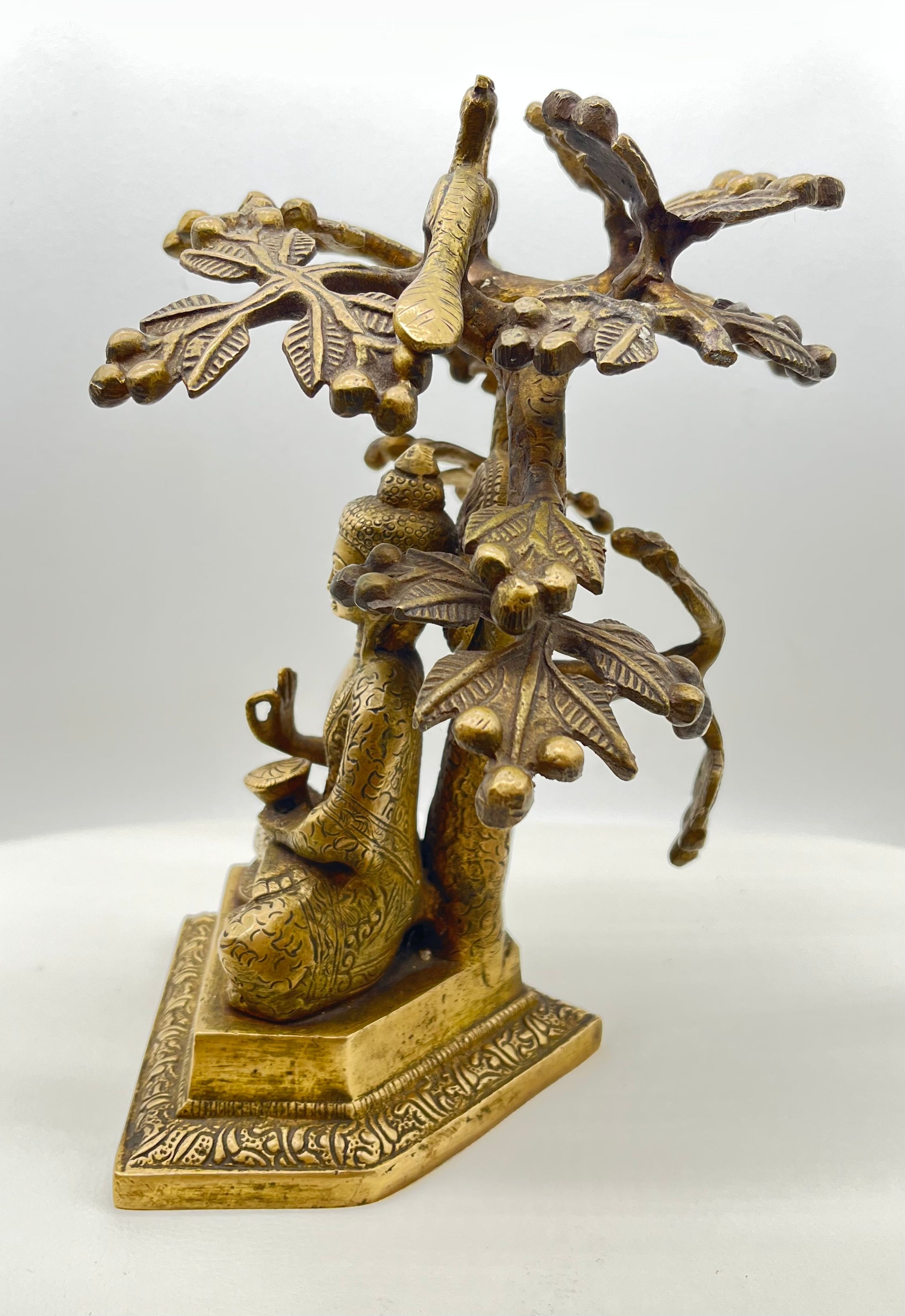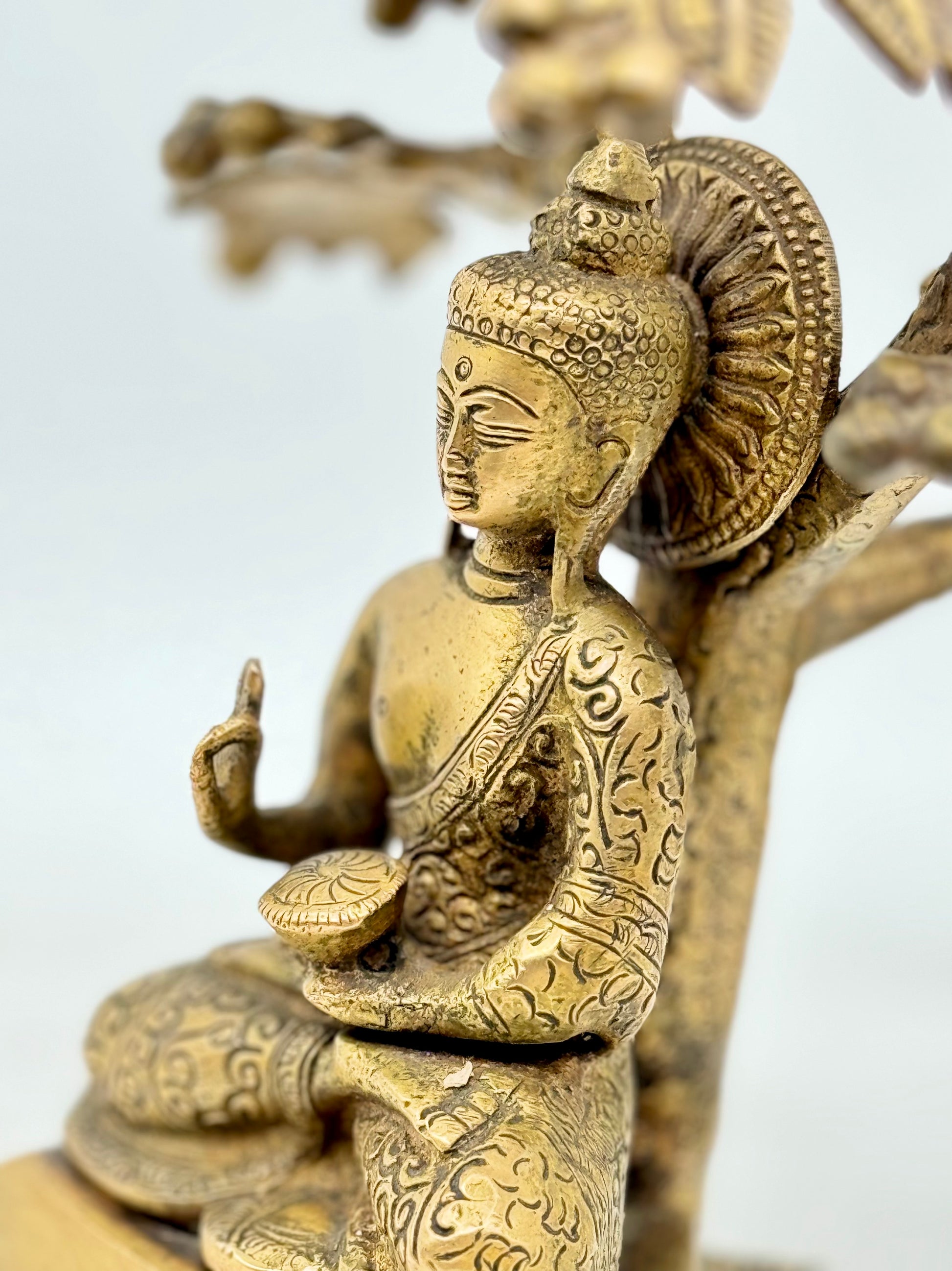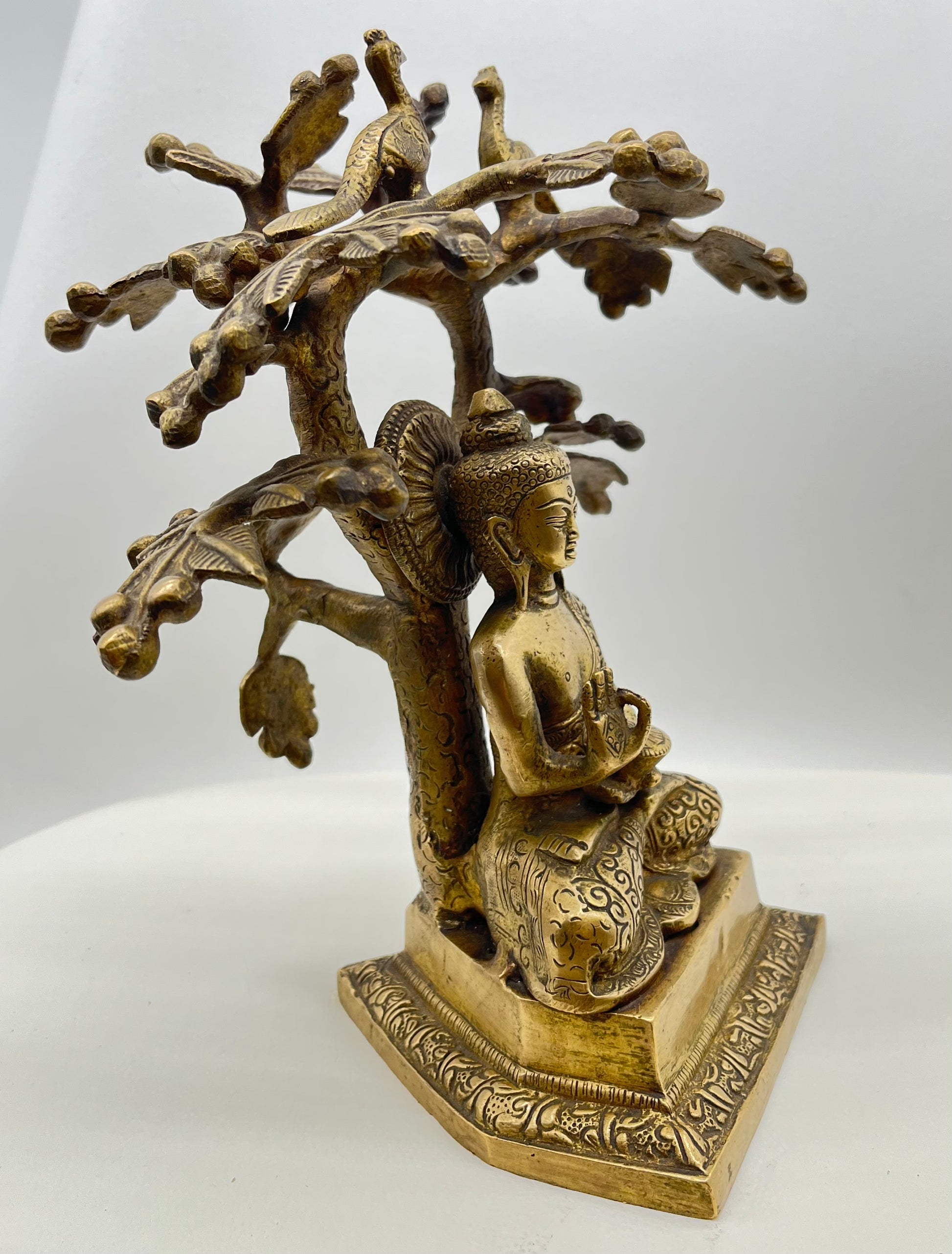 The Buddha is depicted in vajrasana, the diamond pose, symbolizing steadfast meditation and unshakable focus. His right hand is raised in Abhaya Mudra, the gesture of fearlessness and divine protection—offering silent reassurance and inner strength. He sits on a modest throne, with two birds perched above his head, symbolizing spiritual guardianship or celestial presence. Together, the posture and symbolic throne express calm authority, grounded wisdom, and a connection between the earthly and the sacred.