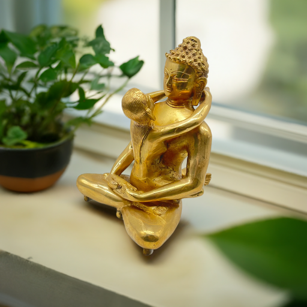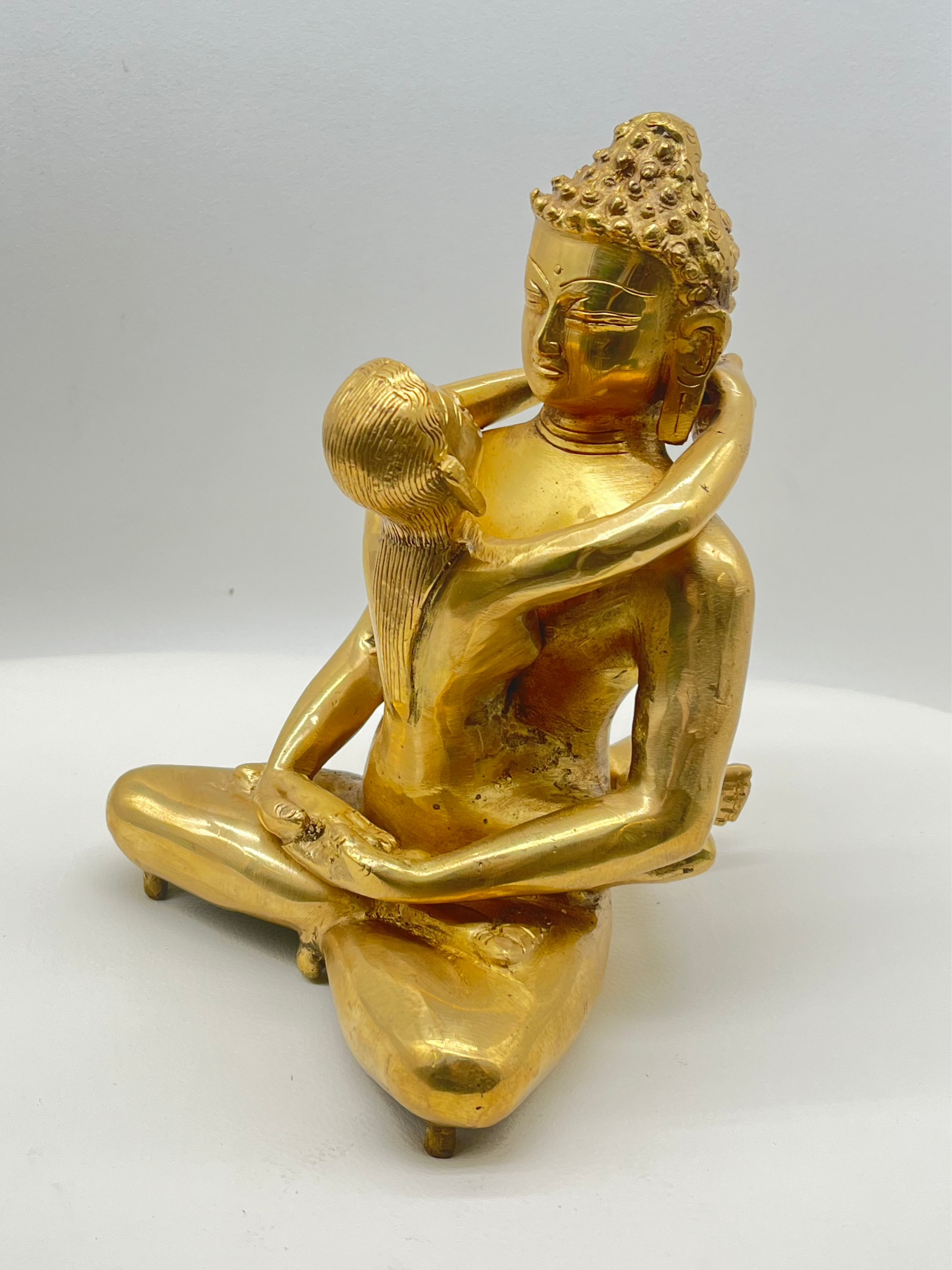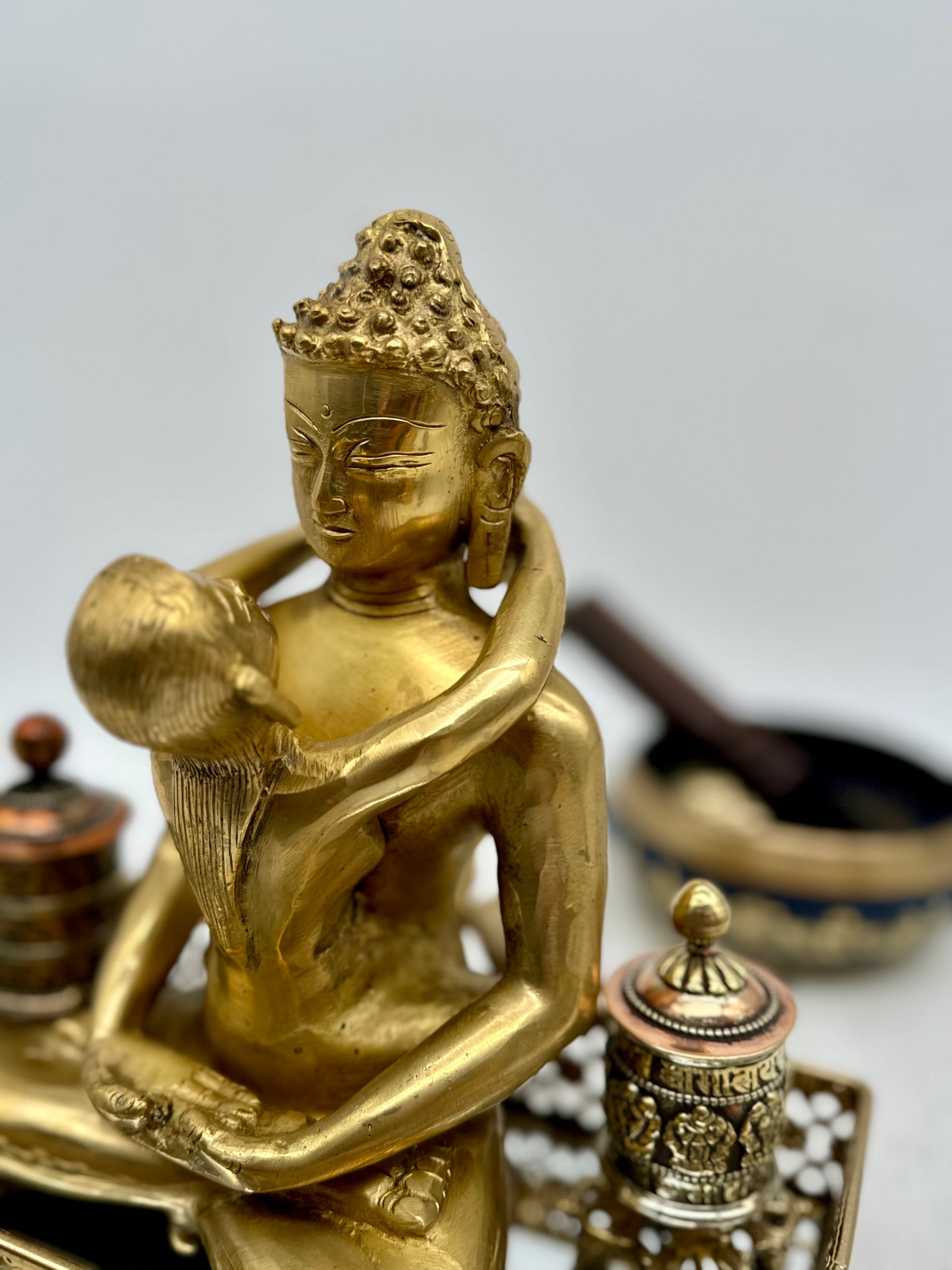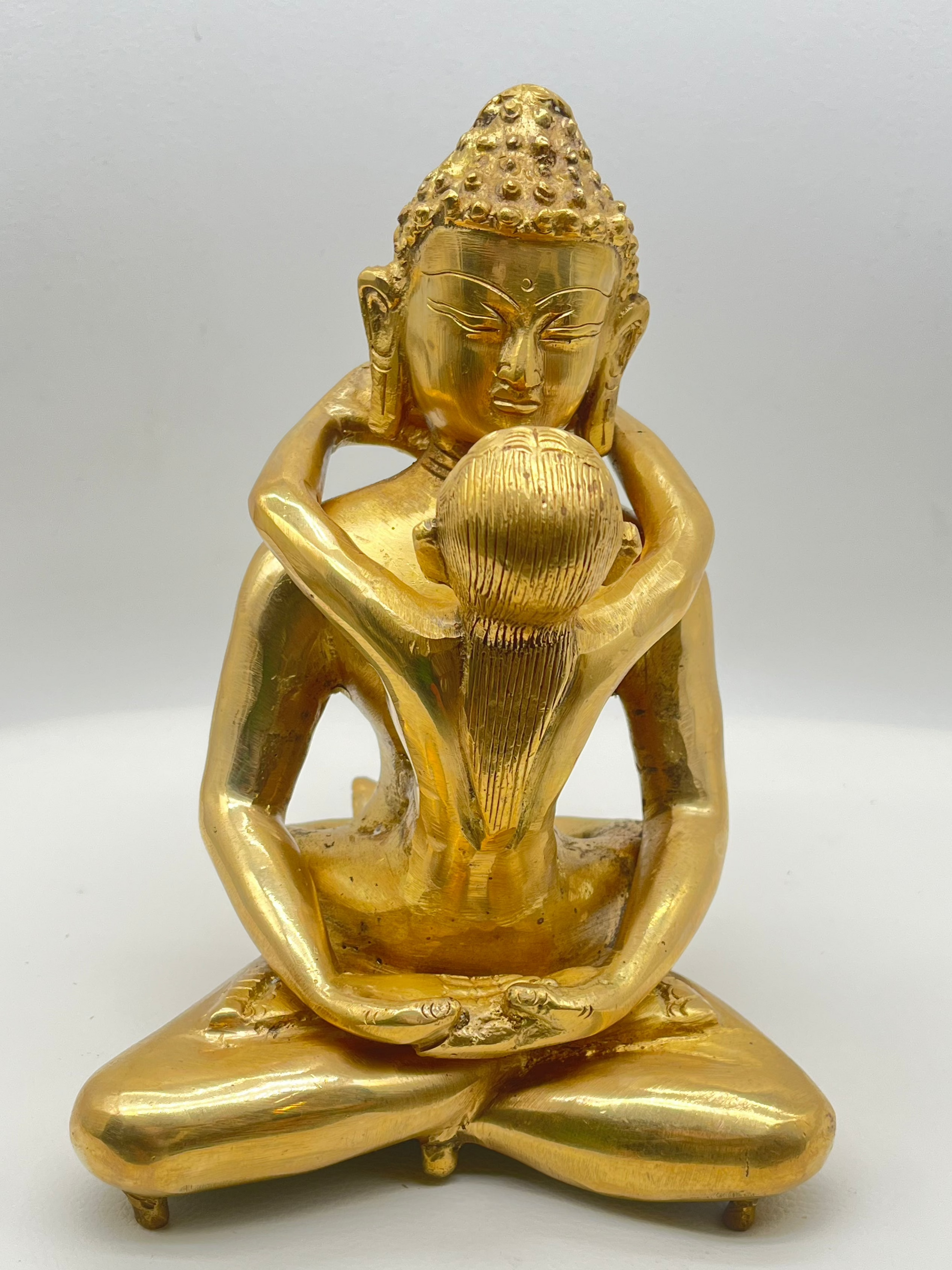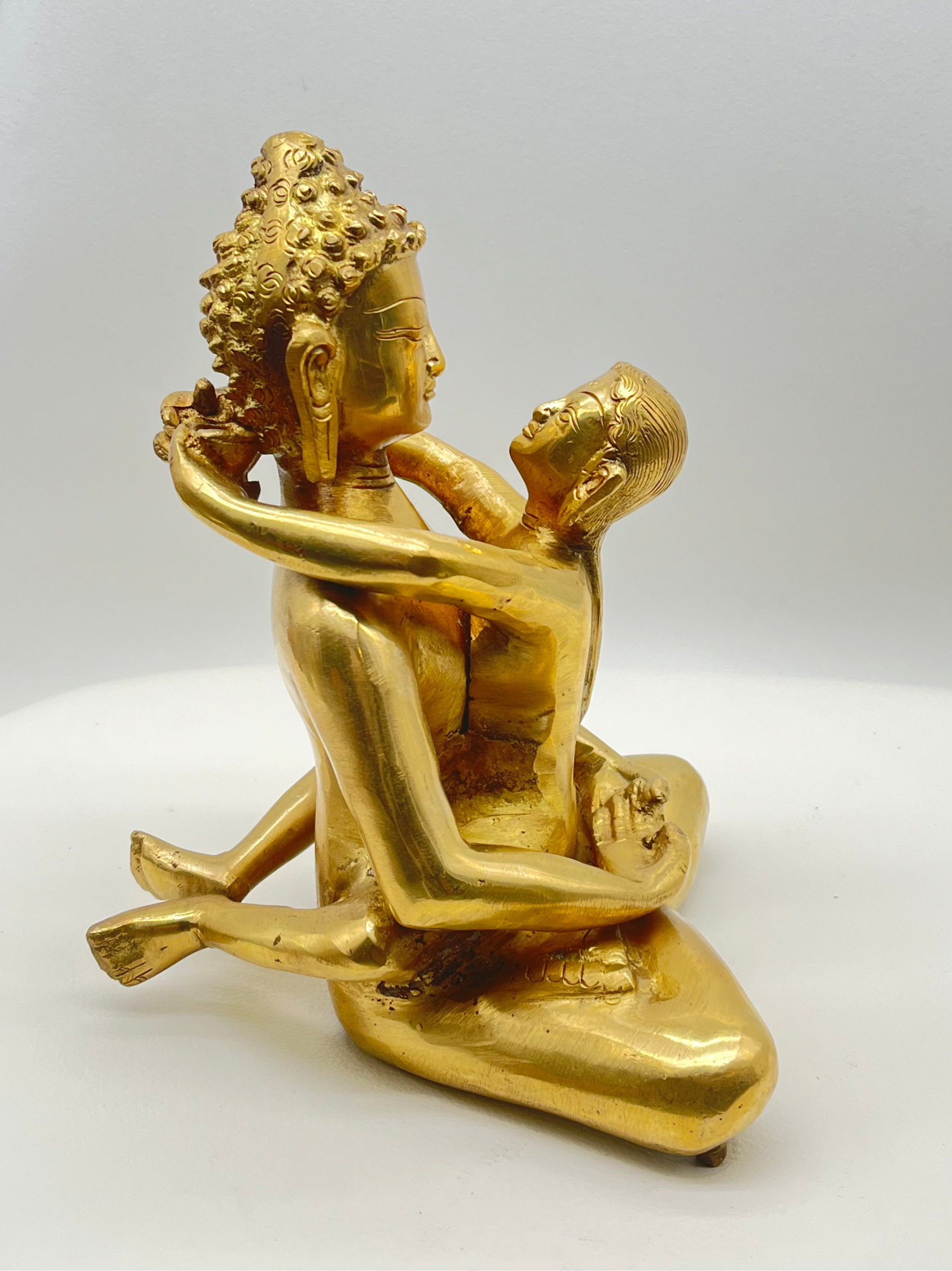 This rare and profound sculpture depicts the Buddha in Yab-Yum, a sacred form in Tibetan Buddhism symbolizing the union of opposites. Embracing a feminine figure – an embodiment of prajñā (transcendent wisdom) – the Buddha represents upaya (compassionate action). Together, they express the inseparability of wisdom and compassion on the path to enlightenment.
